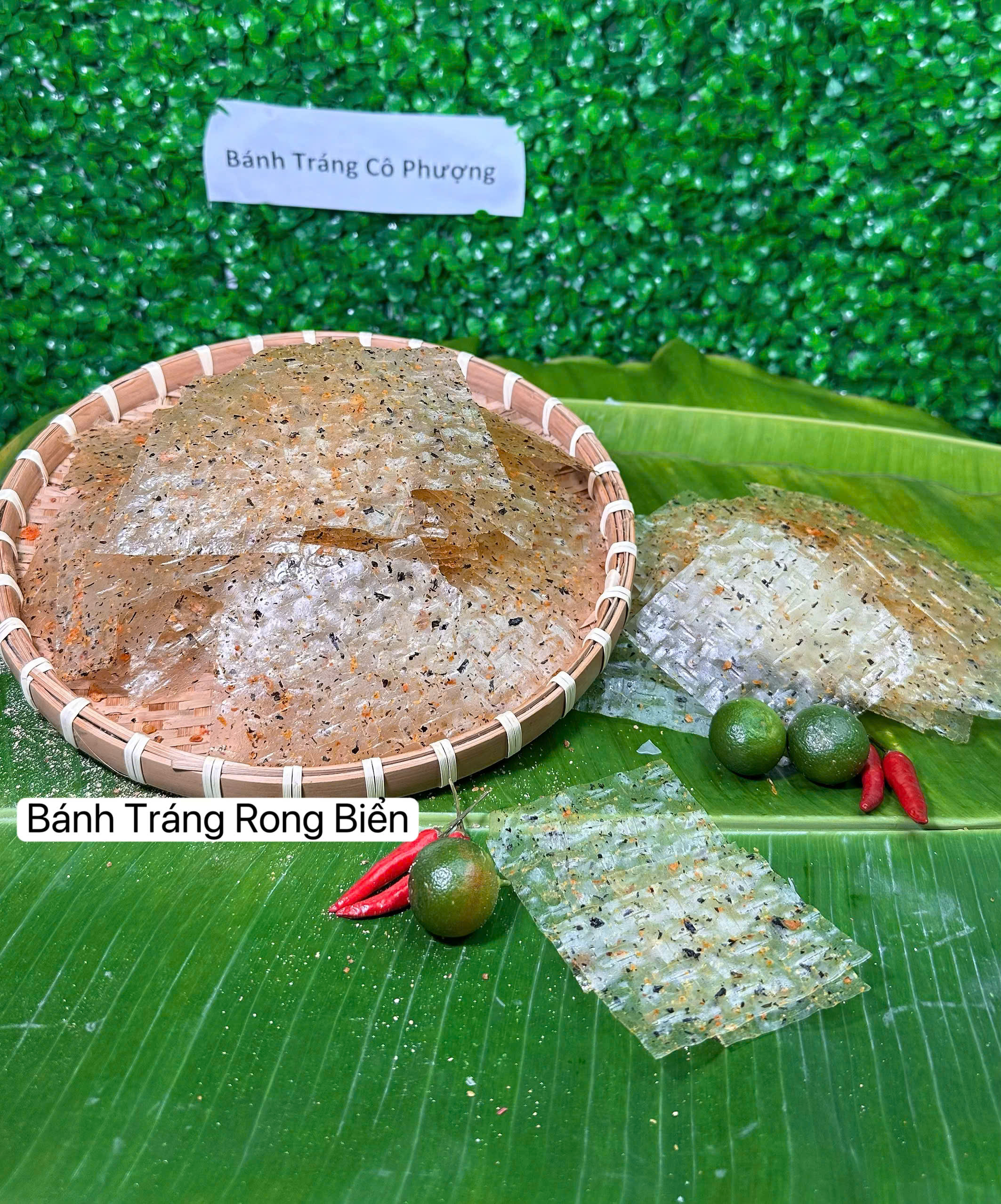 Nguyên liệu gồm: bánh tráng dẻo, rong biển, muối, tỏi phi thơm – sạch sẽ, an toàn