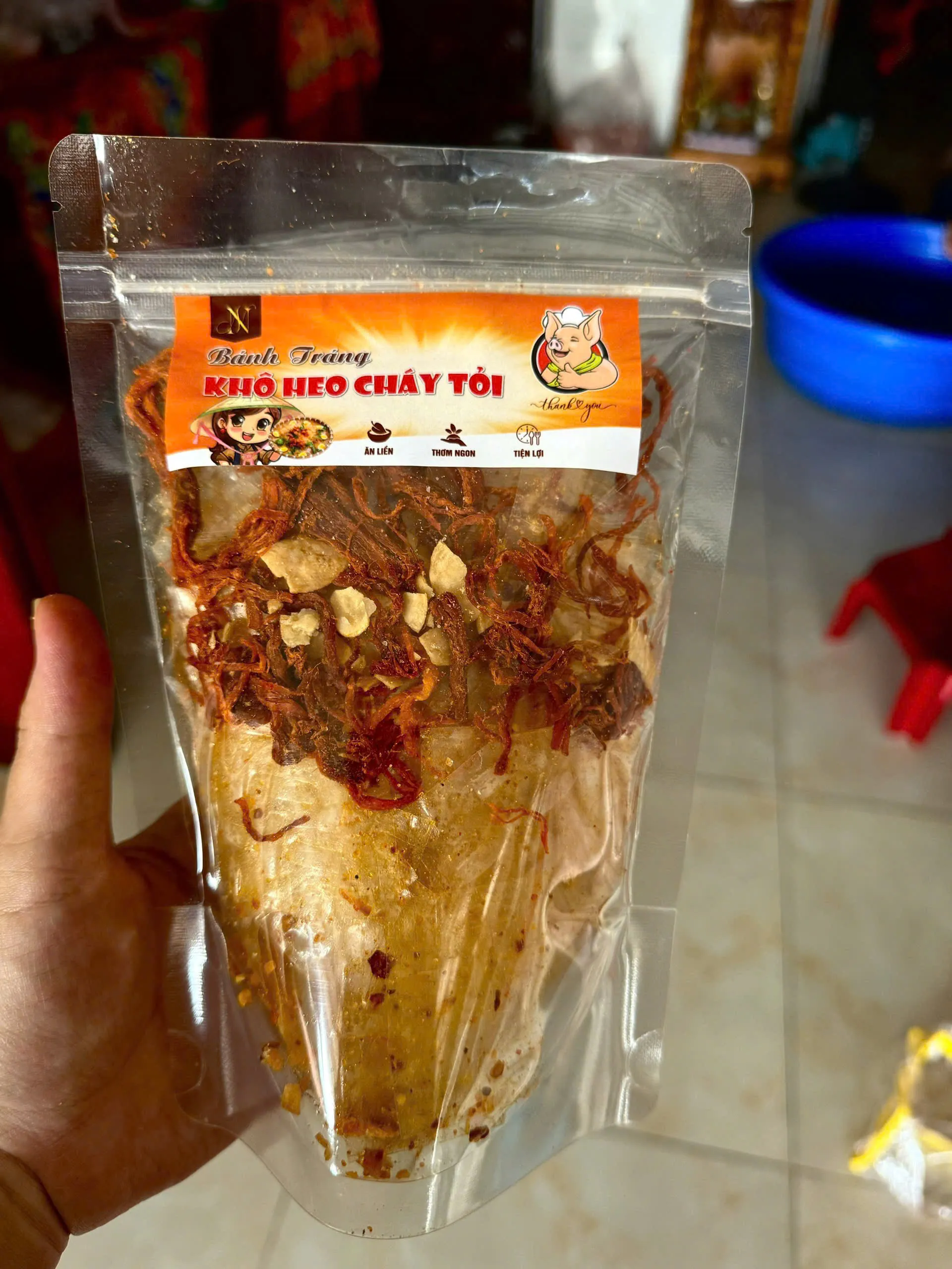 Nguyên liệu chất lượng: bánh tráng, khô heo cháy tỏi sạch – đảm bảo vệ sinh an toàn thực phẩm